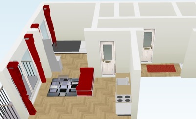 1.床 → 玄関からの廊下のラグはアクセントカラーの赤、ダイニングキッチンの一番面積の大きいラグはアクセントカラーの黒ベースにします。