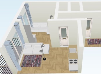 1.床 → 玄関から窓に続くラグマットはアクセントカラーの水色とベーシックカラーの白ベース、リビングスペースの一番面積の大きいラグも、玄関から窓に続くラグマットと同じものを並べる形で作ります。