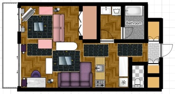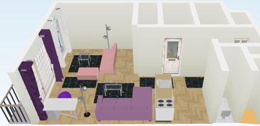 2.睡眠スペース → ソファーベッドを用意し、洋室はアクセントカラーのピンク、LDKはアクセントカラーのパープルにします。