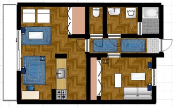 シミュレーションとしては、角部屋ではなく、出口扉は洋室とLDKのベランダ側に1つずつで、LDKと洋室は完全に別々に別れており、収納スペースは洋室、LDKに1つずつあり、生活スペースとしてバス、トイレ別で、独立洗面台があると仮定します。