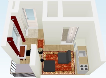 3。ベッドのレイアウトは玄関から見えない部屋の奥の窓のしたにレイアウトし、頭の向きは寝転びながらTVも見れる方向に。TVとTV台はベッドからもデスクセットからも双方からも見れる四つ角にレイアウト。